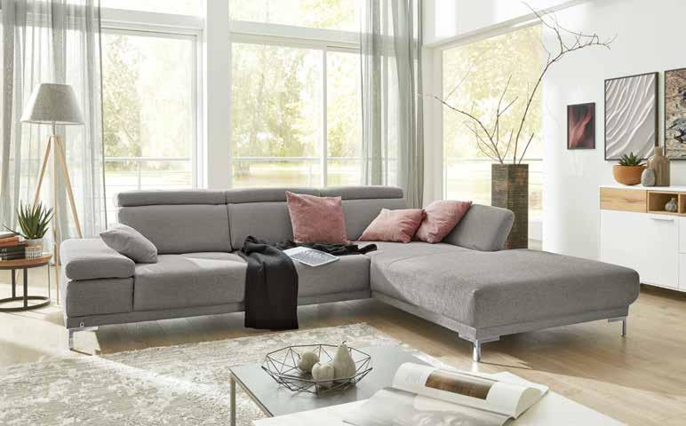 Interliving Sofa Serie 4251, Bezug Stoff platin, Metallfuß, best. aus: 2-Sitzer mit Armteil links inkl. 2x Sitztiefenverstellung, Longchair rechts inkl. Armteilverstellung, Stellmaß ca. 300x225 cm. Bezug: 100% Polyester. Ohne Zierkissen und Decke.
