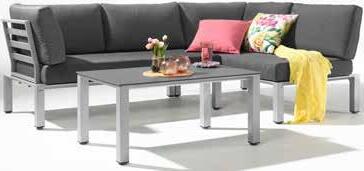 LOUNGEGRUPPE , Aluminiumgestell pulverbeschichtet silberfarben, Outdoorgewebe dunkelgrau, Stellmaß ca. 222,5x145,5x77 cm und Tisch, Glasplatte dunkelgrau, B/H/T: ca. 90x42x60 cm. Ohne Dekokissen.