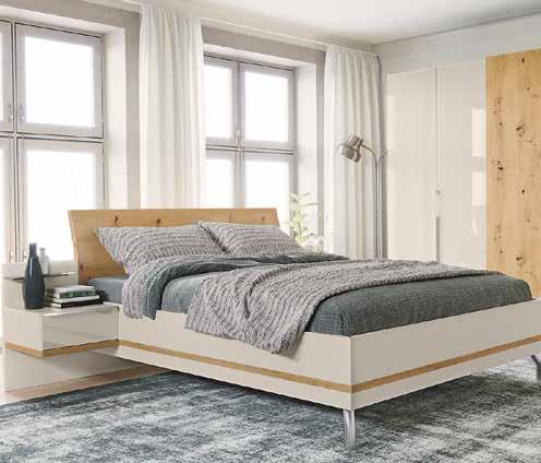 BETTANLAGE, Dekor Perla, Absetzungen und Kopfteil Artisan-Eiche Nachbildung, Metallfuß chromfarbig, Liegefläche ca. 180x200 cm. Inkl. 2 Nachtkonsolen, Schubkasten-Front Perlaglas, mit Glas-Oberboden und 2 Paneelen mit Glasablage.