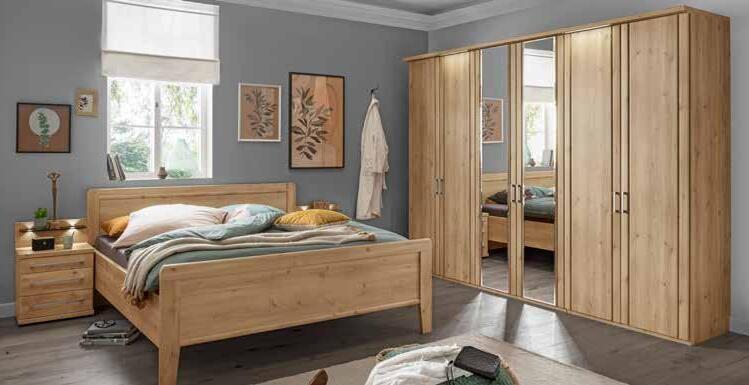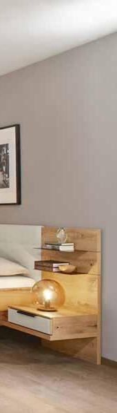 Stollenfußteil LF 180x200 cm in Komforthöhe. Drehtürenschrank 5-trg. mit 3 Spiegeltüren B/H/T: ca. 250x217x58 cm **statt 2.016.- 999.- Drehtürenschrank 6-trg. mit 2 Spiegeltüren B/H/T: 300x217x58 cm **statt 2.125.-1.199.- Nachtkonsolen Paar B: 50 cm mit 2,5 Laden **statt 471.-249.- Kranz mit Beleuchtung, Paneele und Beleuchtung gegen Mehrpreis. Andere Größen, passende Beimöbel und Zusammenstellungen zum individuellen Preis erhältlich. 499.**statt 1.051.BETT Erholsam Schlafen in moderner Atmosphäre