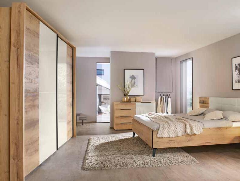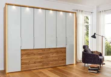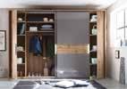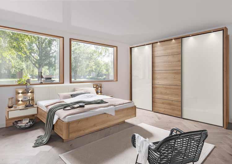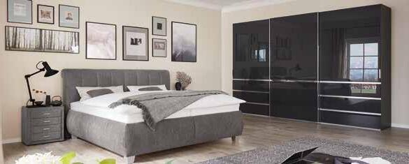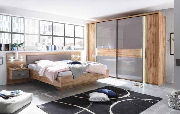 Modernes Schlafzimmer in Wildeiche NB kombiniert mit Glas basaltgrau. Schrank mit 2 Schwebetüren und 2 Drehtüren B/H/T: ca. 312x226x60 cm *statt 3.008.- 1.499.- BETTANLAGE Liegefläche ca. 180x200 cm inkl. gepolstertem Kopfteil und 2 Nachtkonsolen inkl. Paneele und Glasablagen mit LED-Beleuchtung. Passepartout, Dämpfer und Beimöbel gegen Mehrpreis erhältlich.