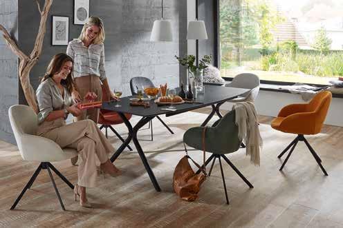 Esstisch, Platte Bootsform, Eiche furniert, schwarz matt lackiert, X-Gestell Metallrohr schwarz, ca. 220x100 cm *statt 1.747.- 999.- SCHALENSTUHL, in Cord Bezug, verschiedene Farben, Ergo-Schale in Formschaum, Stativ-Gestell in Eisen schwarz mit Drehfunktion 180° drehbar mit Rückholfunktion *statt 601.- 299.-