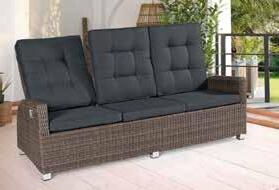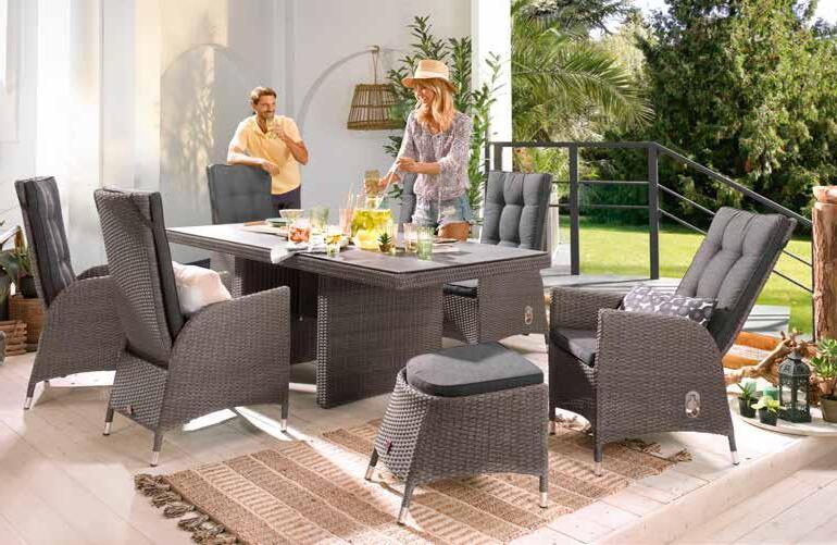 Gartenmöbelserie, Aluminiumgestell, Kunststoffgeflecht grey mix. Diningsofa, Rückenlehne verstellbar, in Speisehöhe, B/H/T: ca. 211x111x90 cm, inkl. Kissen, ohne Dekokissen 999.- Wangentisch, Tischplatte Glas keramikbeschichtet, L/B/H: ca. 220x100x75 cm 799.- Positionsstuhl, Rückenlehne verstellbar, B/H/T: ca. 65x112x62 cm, inkl. Kissen je 199.- Hocker, B/H/T: ca. 57x44x50 cm, inkl. Kissen 119.-