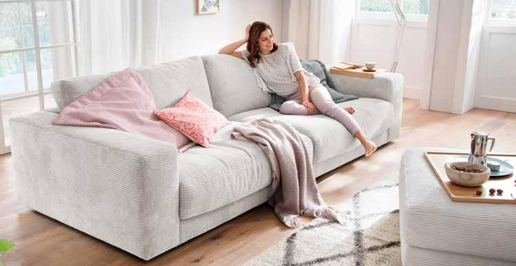Modernes SOFA, mit trendigem Stoffbezug in Cord light snow, B/T: ca. 290x127 cm, mit losen Rückenkissen. Kissen, passender Hocker, andere Farben und Zusammenstellungen zum individuellen Preis erhältlich.