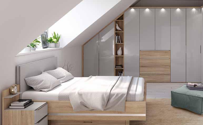 Modernes SCHLAFZIMMER in Atlantic Oak hell NB mit Fronten in Glas champagner und Griffleisten in Griffleisten schwarz. BETT mit Polsterkopfteil champagnerfarbig LF 180x200 cm.