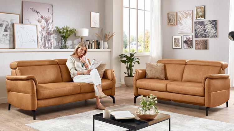 Polstergarnitur, Bezug Leder honey, Metallfuß schwarz matt, best. aus 2x 2-Sitzer, Rücken Spannstoff. 2-SITZER, B: ca. 186 cm *statt 2.504.- 1.299.Ohne Zierkissen.