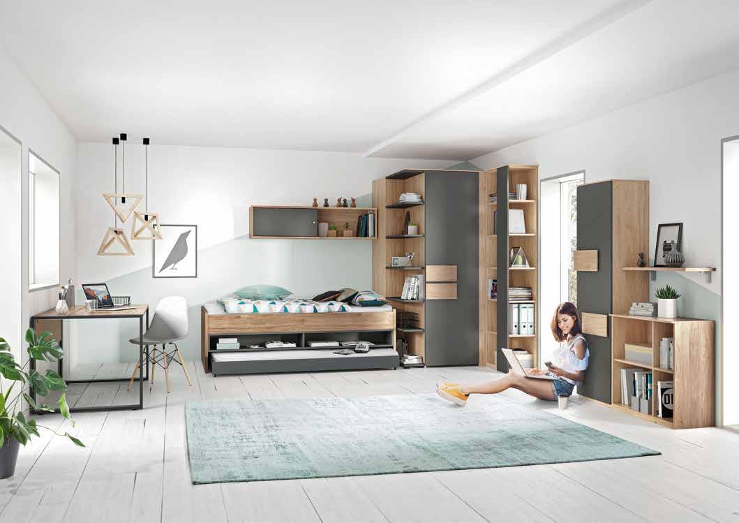 Face- Clip/Applikations Farben zur Auswahl. zungen anthrazit. 1 Eckkleiderschrank B/H/T: ca. 126x215x133 cm 999.- 2 Anstellregal, B/H/T: ca. 35x215x60 cm 349.- 3 KOJENBETT mit 2 offenen Fächern 4 Schreibtisch mit Kufenfuß inkl. Kabelmanagement, Platte geteilt mit Klappfunktion 279.- 5 Hängeelement mit Schiebetür, B/H/T: ca. 150x37,4x29,7 cm 199.cm 229.- 7 Regal B/H/T: ca. 75x74x35 cm 149.- 8 Wandboard B/H/T: ca. 75x2,2x25,5 cm 59.- Matratzen, Lattenrost, Stuhl und Beleuchtung gegen Mehrpreis. llen Preis.