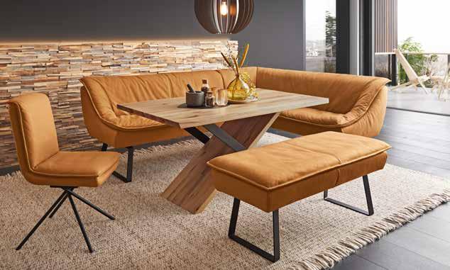 POLSTERECKBANKGRUPPE, Bezug Leder India sun, Gestelle Metall schwarz matt. ESSTISCH, Platte Balkeneiche massiv, X-Gestell Holzwange Balkeneiche massiv und Metallwange schwarz matt, ca. 160x90 cm