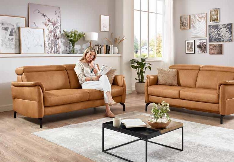 Polstergarnitur, Bezug Leder honey, Metallfuß schwarz matt, best. aus 2x 2-Sitzer, Rücken Spannstoff. 2-SITZER, B: ca. 186 cm *statt 2.504.- 1.299.- Ohne Zierkissen.