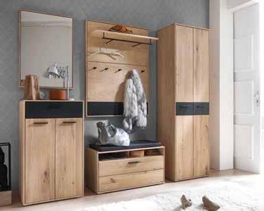 Moderne GARDEROBE, Balkeneiche geölt, Front massiv, Korpus furniert, Absetzung anthrazit, B/H/T: ca. 238x207x38 cm. 1 Spiegel, B/H: ca. 63x87 cm *statt 254.- 129.- 2 Garderobenschrank, B/H/T: ca. 63x207x38 cm *statt 1.395.- 699.3 KOMMODE , B/H/T: ca. 63x105x38 cm 4 Garderobenbank, B/H/T: ca. 93x48x38 cm *statt 702.- 349.- 5 Sitzkissen, B/H/T: ca. 85x4x34 cm *statt 78.39.- 6 Garderobenpaneel, B/H/T: ca. 93x120x30 cm *statt 582.- 299.Andere Zusammenstellungen zum individuellen Preis erhältlich.