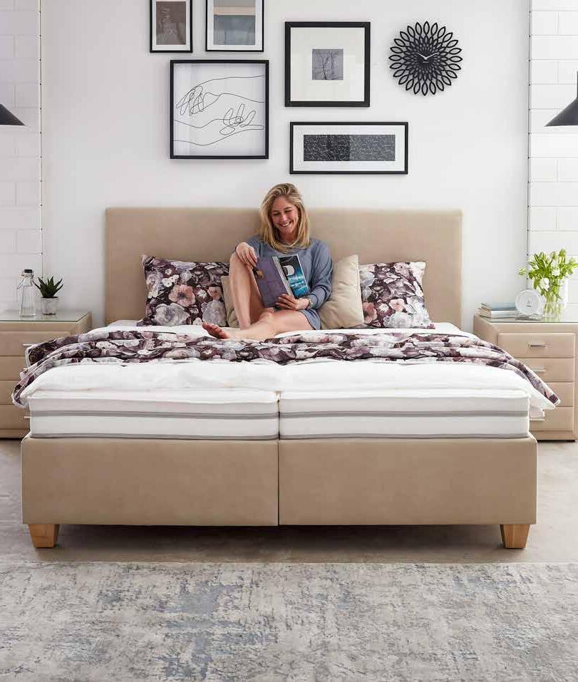 Schlafen in moderner Atmosphäre Modernes FAMILIEN-BOXSPRINGBETT mit Stoffbezug ab LF 160x200cm ausgestattet mit Bonellunterfederung und 7-Zonen-Mikro-Tonnentaschenfederkernmatratzen, wahlweise in Härte H2 od. H3. LF 160x200 cm. LF 180x200 cm 1.599.- LF 200x200 cm 1.799.- LF 240x200 cm 1.999.- Topper, Nachtkonsolen, Bettwäsche und Plaid gegen Mehrpreis. Andere Stoffe und Zusammenstellungen zum individuellen Preis. *statt 2.600.1.399.160x200 cm Stoffauswahl Inkl. 7-Zonen-Tonnentaschenfederkernmatratze Auch als Familienbett erhältlich! (Liegefläche 240x200 cm)