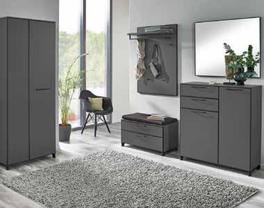 Garderobenkombination, Front und Korpus Lack grau. 1 Spiegel, B/H: ca. 97x77 cm *statt 325.- 159.- 2 Dielenschrank, B/H/T: ca. 70x192x37 cm *statt 1.230.- 649.- 3 Kommode, B/H/T: ca. 100x107x37 cm *statt 1.499.- 749.4 Garderobenbank, B/H/T: ca. 84x44x40 cm *statt 905.- 499.- 5 Sitzkissen, Nubokoptik anthrazit, Bezug 100% Polyester, B/H/T: ca. 80x4x38 cm *statt 131.69.- 6 GARDEROBENPANEEL , B/H/T: ca. 80x109x27 cm.