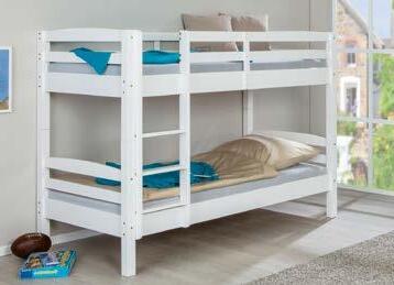 ETAGENBETT, Kiefer massivweiss lackiert, inkl. Lattenrost, B/T/H: ca. 210x102x148 cm, ab 6 Jahren, kann kinderleicht übereinander, aber auch einzeln gestellt werden. Matratze gegen Mehrpreis.