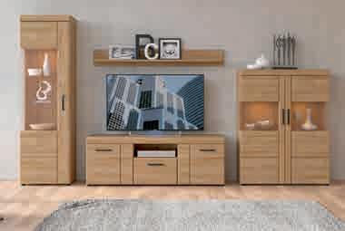 Wohnprogramm, Front Hochglanz weiß, Korpus alpinweiß/schwarz, inkl. Beleuchntung, best. aus: Vitrine, B/H/T: ca. 64x149x39 cm. Regal, B/H/T: ca. 64x125x25 cm. Paneel, B/H/T: ca. 141x25x20 cm. TV-Unterteil, B/H/T: ca. 150x52x45 cm.
