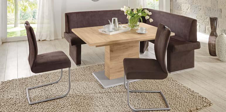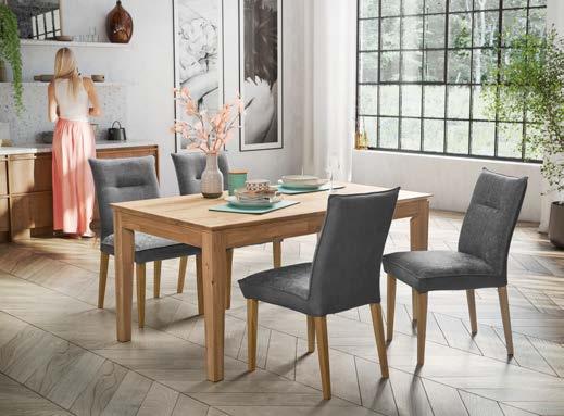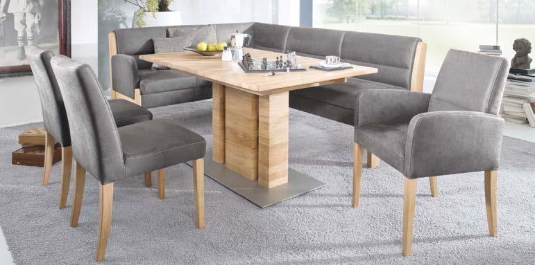 Eckbankgruppe mit praktischer Stauraumlösung in den Sitzelementen und Hockerbänken. Stoff grau, Kontrastnaht beige. Armlehnstuhl *statt 838.- je 449.Polsterstuhl *statt 571.- je 299.- Esstisch ca. 140(185)x90 cm mit Synchronauszug *statt 2.993.- 1.549.- ECKBANK in Wildeiche massiv geölt, ca. 169x217 cm. Kissen, andere Farben und Zusammenstellungen zum individuellen Preis erhältlich.