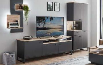 Moderne WOHNWAND, Korpus und Front in Cosmos grey NB, Absetzung in Eiche Viking NB, Füße in Metall Cosmos grey, B/H/T: ca. 287x188x50 cm. Beleuchtung, Beimöbel und andere Zusammenstellungen zum individuellen Preis erhältlich.