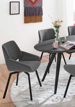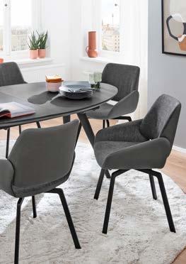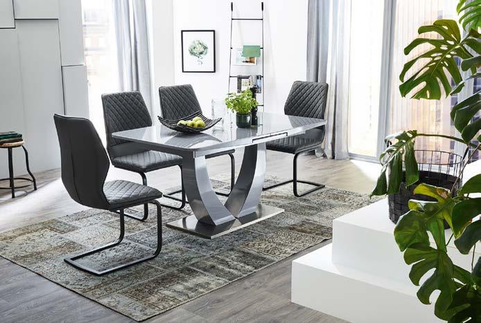 Auszugs-Esstisch, Gestell Hochglanz grau, Glasplatte grau, Fußplatte Edelstahl, ca. 160(200)x90 cm *statt 1.085.- 599.- SCHWINGSTUHL, Stoffbezug Lederoptik grau, Gestell matt schwarz, B/H/T: ca. 47x100x69 cm.