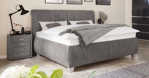 Modernes POLSTERBETT in Stoffbezug grau, Liegefläche ca. 160x200 cm, Liegehöhe ca. 68 cm, ausgestattet mit stabilen Lattenrost geeignet bis 200 kg und stützkräftigen 7 Zonen Tonnentaschenfederkernmatratzen in 3 Härten, inkl. geräumigen Bettkasten. In LF ca. 180x200 cm 1.799.- Nachtkonsolen, Lampen, Kissen, Plaid, andere Stoffe, Größen und Zusammenstellungen gegen Mehrpreis.