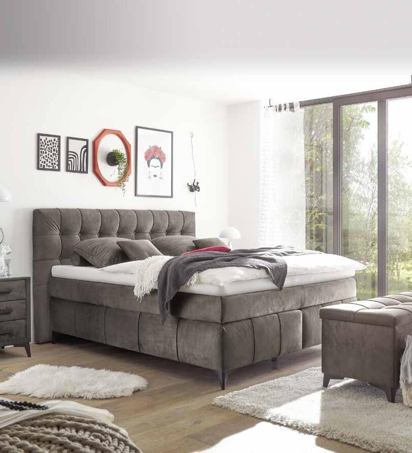 Modernes BOXSPRINGBETT in trendigem Stoffbezug LF 140x200 cm, mit TTFK-Unterbau und 7-Zonen Micro-Tonnentaschenfederkern Matratze H2/H3 oder H4 erhältlich. 180x200 cm 3.299.- 160x200 cm 2.999.- Andere Farben, Stoffe, Größen, Holzsockel, Nachtkonsolen, Lampen, Kissen und Plaid gegen Mehrpreis. Andere Zusammenstellungen zum individuellen Preis.