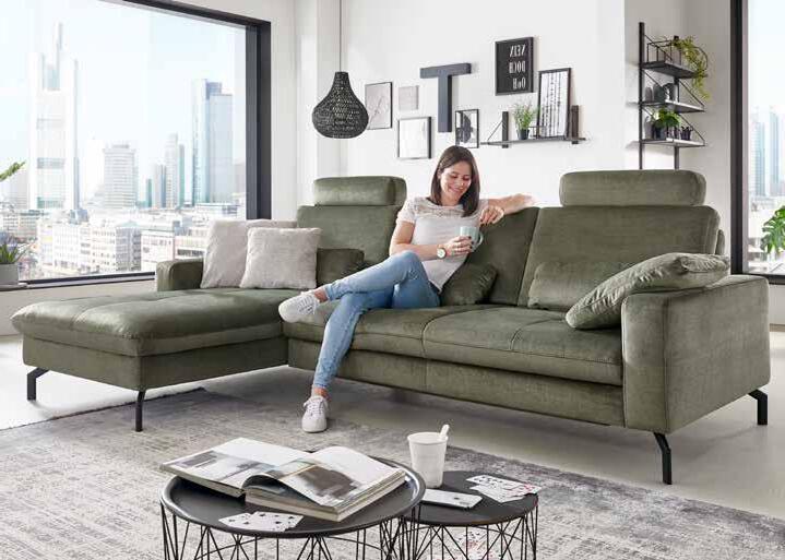 ECKKOMBINATION, Bezug olive, Füße Metall schwarz, Stellmaß ca. 178x276 cm. Rücken echt, Sitzkomfort: Kaltschaum, Liegefläche ca. 238x135 cm. Kissen, Bettfunktion, Sitztiefenverstellung, Kopfstütze, Steckrücken gegen Mehrpreis.