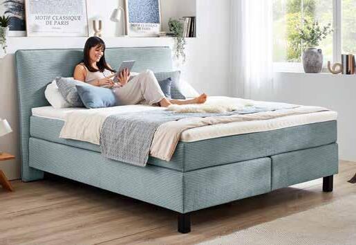 Modernes BOXSPRINGBETT in trendigem Cord-Bezug, Liegefläche ca. 140x200 cm, ausgestattet mit 7-Zonen-Taschenfederkern-Matratze und Topper. LF 180x200 cm *statt 2.734.- 1.299.- Andere Stoffe und Farben gegen Mehrpreis. Nachtkonsolen, Lampen, Kissen und Plaid zum individuellen Preis.