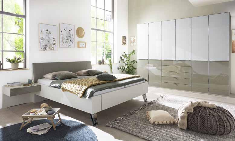 Modernes Schlafzimmer, Korpus weiß, Front Glas weiß /kieselgrau. Funktionsschrank 6-trg. B/H/T: ca. 300x236x58 cm ohne Schubkästen 1.499.mit 5 Schubkästen 1.899.- 1 Paar Nachtkommoden schwebend 299.- BETT, LF ca. 180x200 cm mit Polsterkopfteil. Andere Größen, Farben und