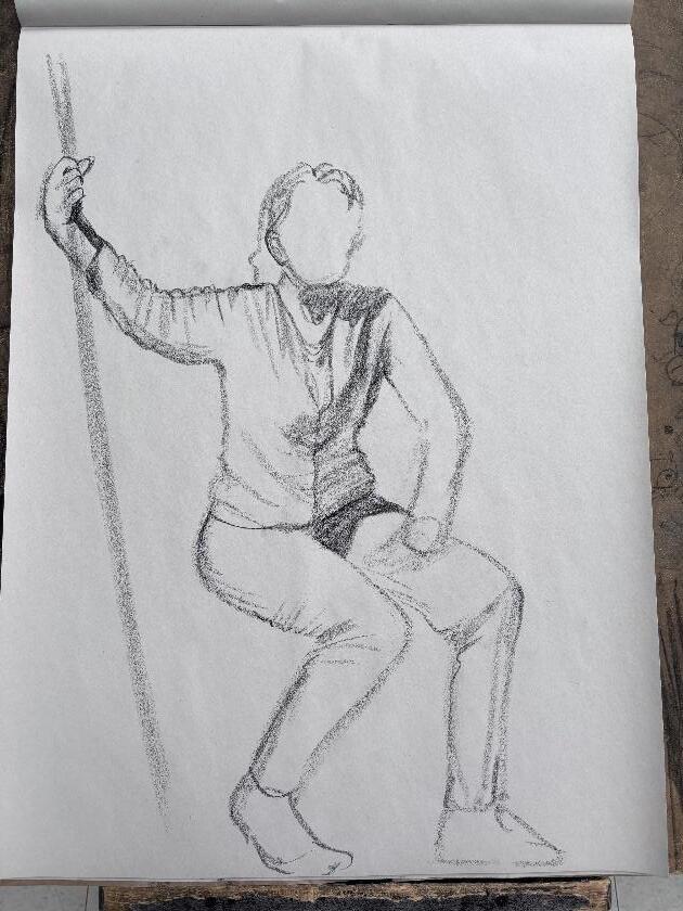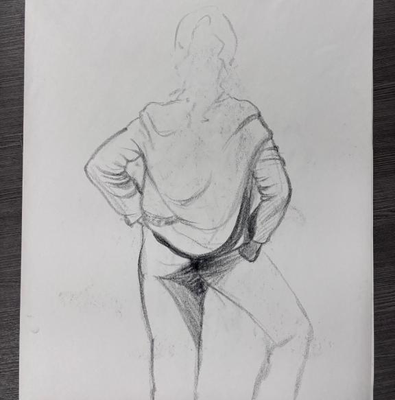 Anatomy and Life Drawing 最終作品集中的空間 練習作業,練習中運用輔助線條來正確定位模特兒 比例與位置。