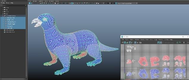 Digital Sculpting Tools 課程中,在 MAYA 完成拓 樸後進行 UV 拆解,我特地用不同顏色區分生物的 左右兩側。