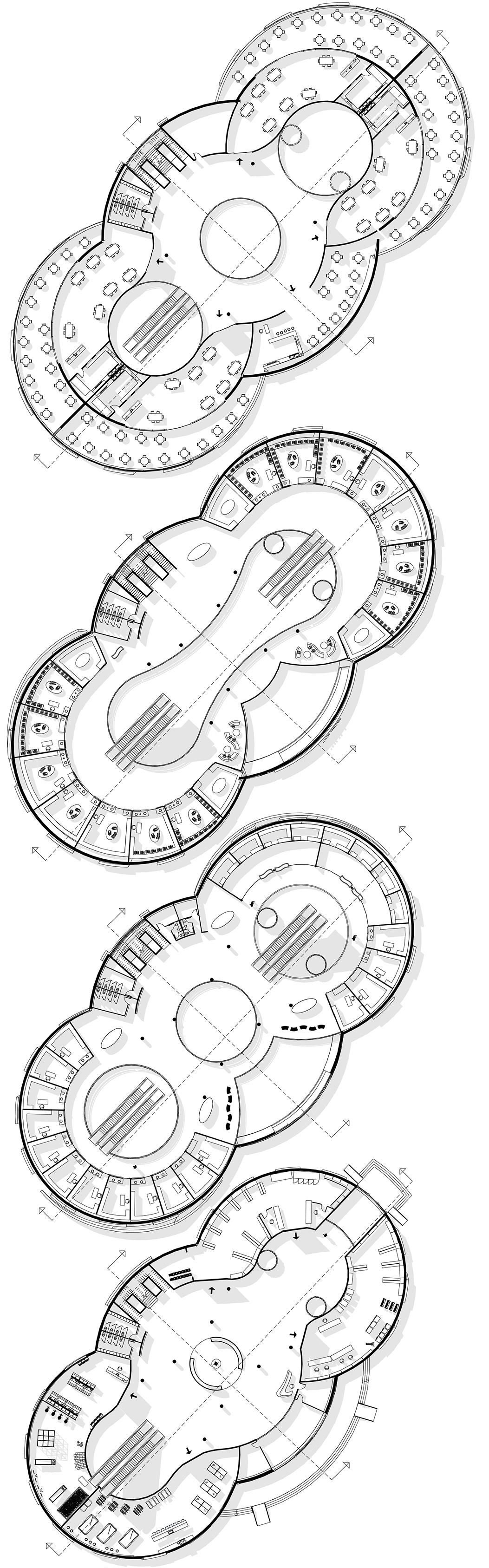 The lobby’s roof is covered with a hollow covering featuring conical-section hollows, which maximize the entrance of indirect solar lighting. Bridges are present to connect the floors within the lobby, facilitating interaction and access between all Studios