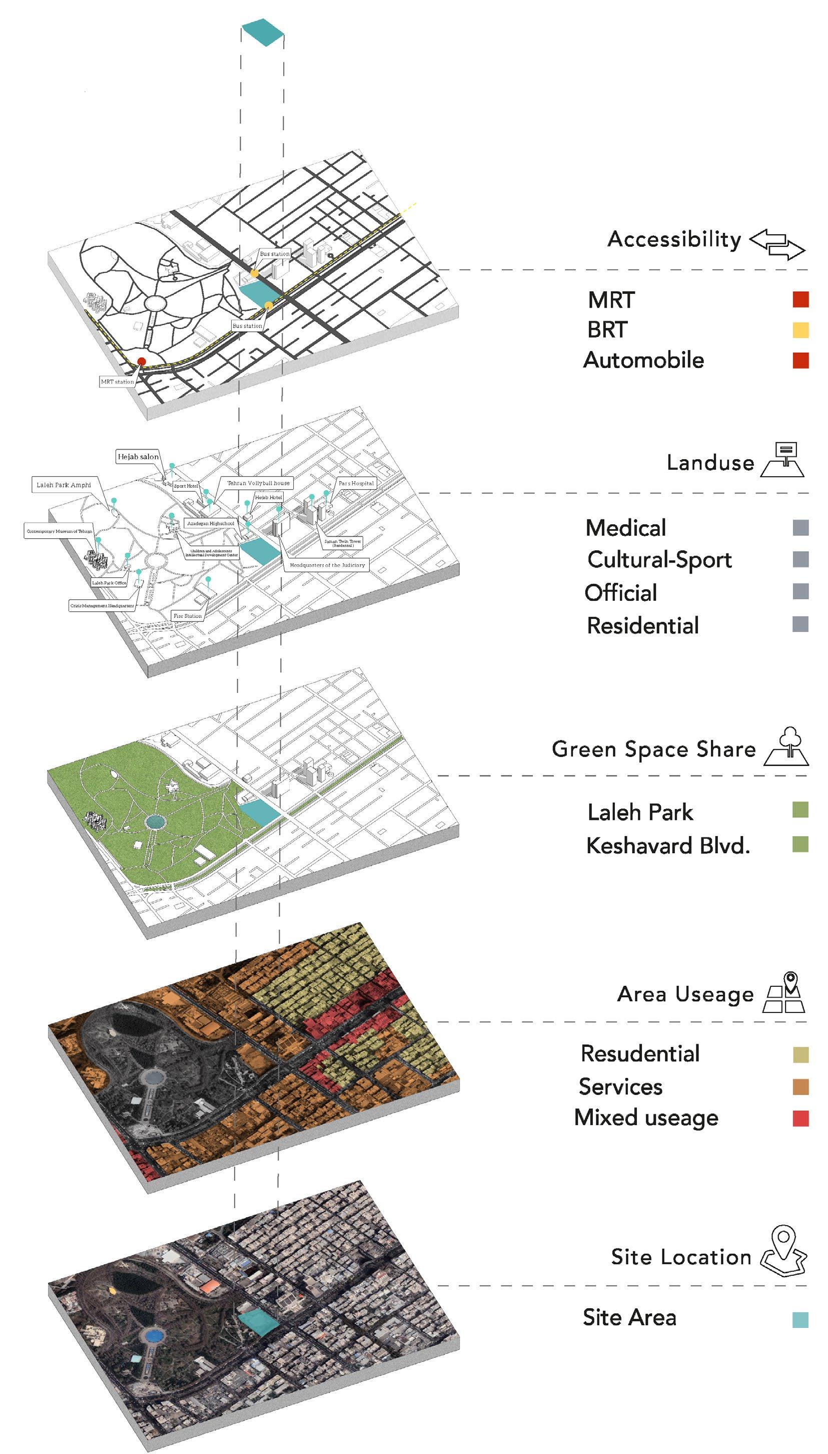 The plot is located in Tehran, next to Laleh Park, at the corner of Hijab Street and Keshavarz Boulevard. The land area is 8763 square meters with an overall slope of 7% north-south.