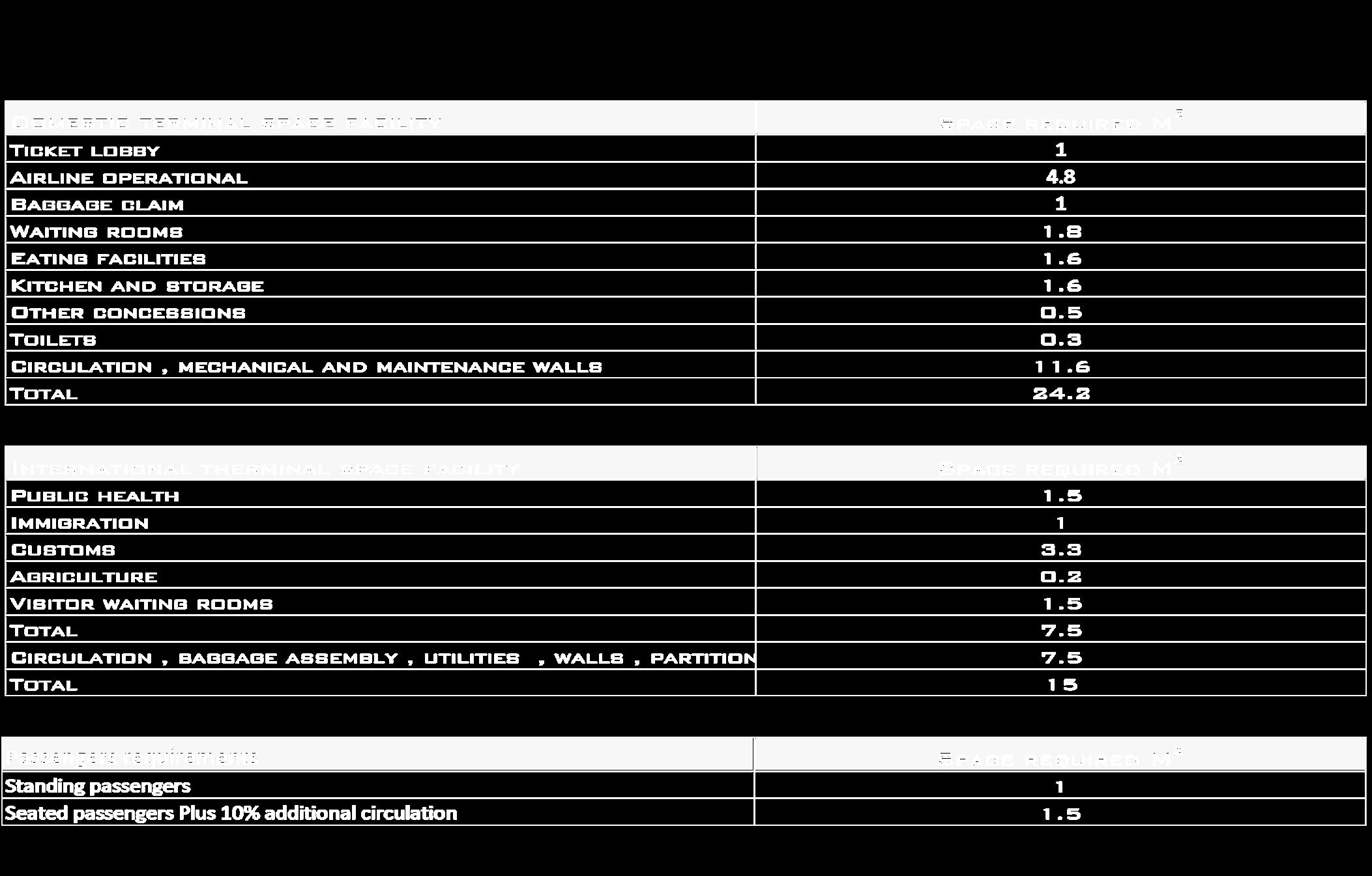 If Terminal stands 20 Million passangers annoul . 20 Million / 360 days * 24 hours = The Result * total area for each service = How Much Space Does each function Need .
