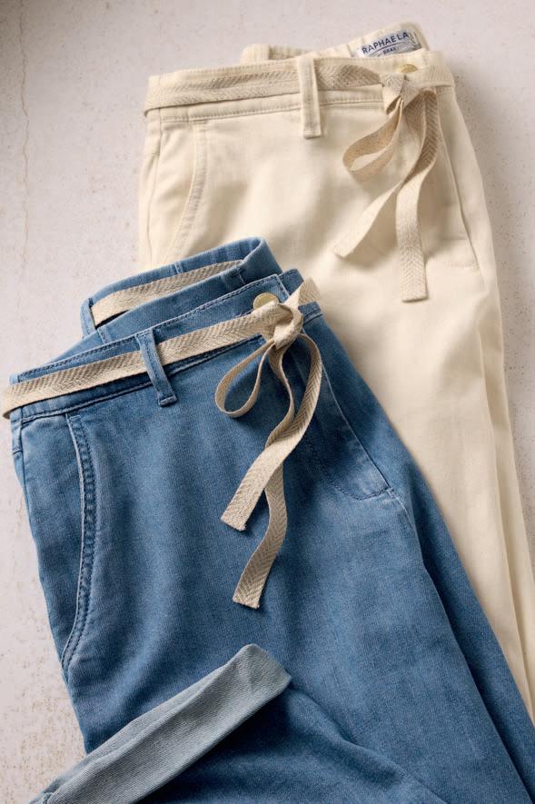 Die neue, komfortable Denim Chino besticht durch eine lässige, konische Silhouette und ein feines Zierbändchen am Bund.