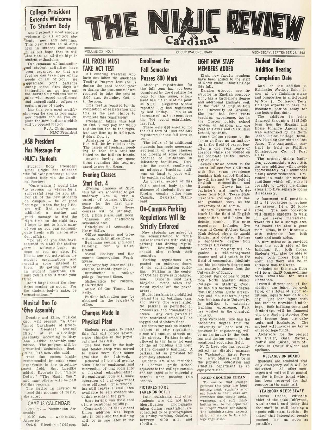 Ml\\' I eitend a most sincere welcome to all or you stu' dents, new and returning This year marks an alJ-time high In student enrolJmenl. •'' ls ou r hope that It will iuso mark an all - ti me high in student enthusiasm oir programs or instruction