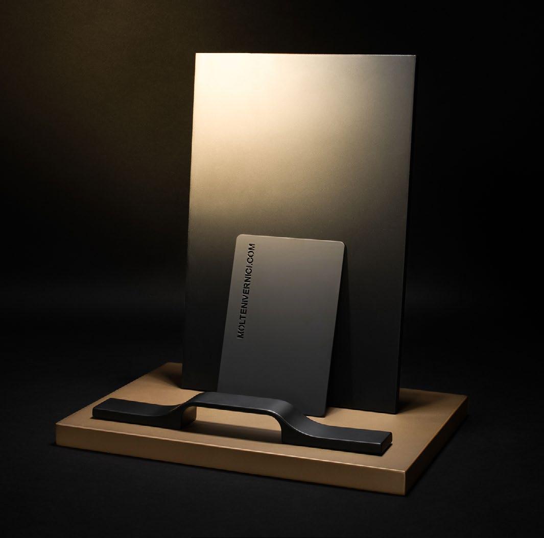 2k two-component varnish, Thermic™ represents a series of products with a direct adhesion on iron, zama, aluminum, brass, bronze, plastic polymers like nylon, ABS, PA-6, polycarbonate, rigid polyurethane, acetate, MDF, plywood, laminate and wood (through the employment of specific primers), which are characterized from a particular working process of deposition, through a traditional application by spray gun, of an enzyme with a colored pigment; when this pigment reaches the temperature of 30°C or 60°C, it reacts becoming transparent and showing the original coloration or texture of the treated support.