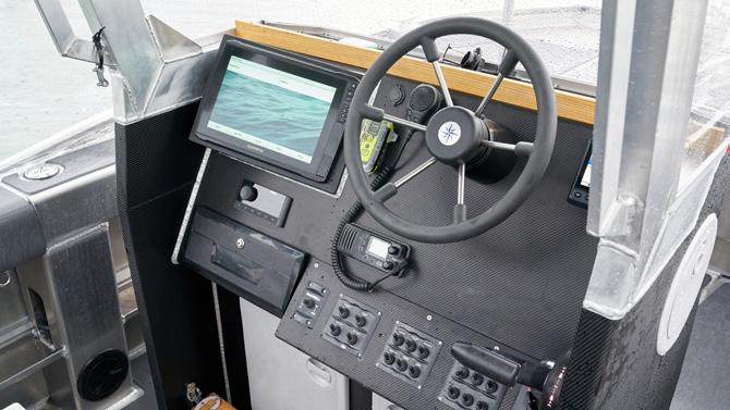 The new White Pointer 870 WA is based on the well-proven 8.40m - 8.70m platform with a wide 2.75m beam and a 6mm hull-plate construction. However, the cabin has been borrowed from the 700 Cabin that had the perfect front window styling. The one-piece curved screen has no mullions and uses one huge windscreen wiper. The roofline remained much the same as the 700, albeit extended. The deeply recessed bulwarks allow safe passage around the wheelhouse to the open bow area. I liked the fact that there is enough toe space provided under the centre cab to turn 180 deg without getting caught up in the alloy structure or tripping over your feet. Handrails on the wheelhouse provide that extra feeling of security.