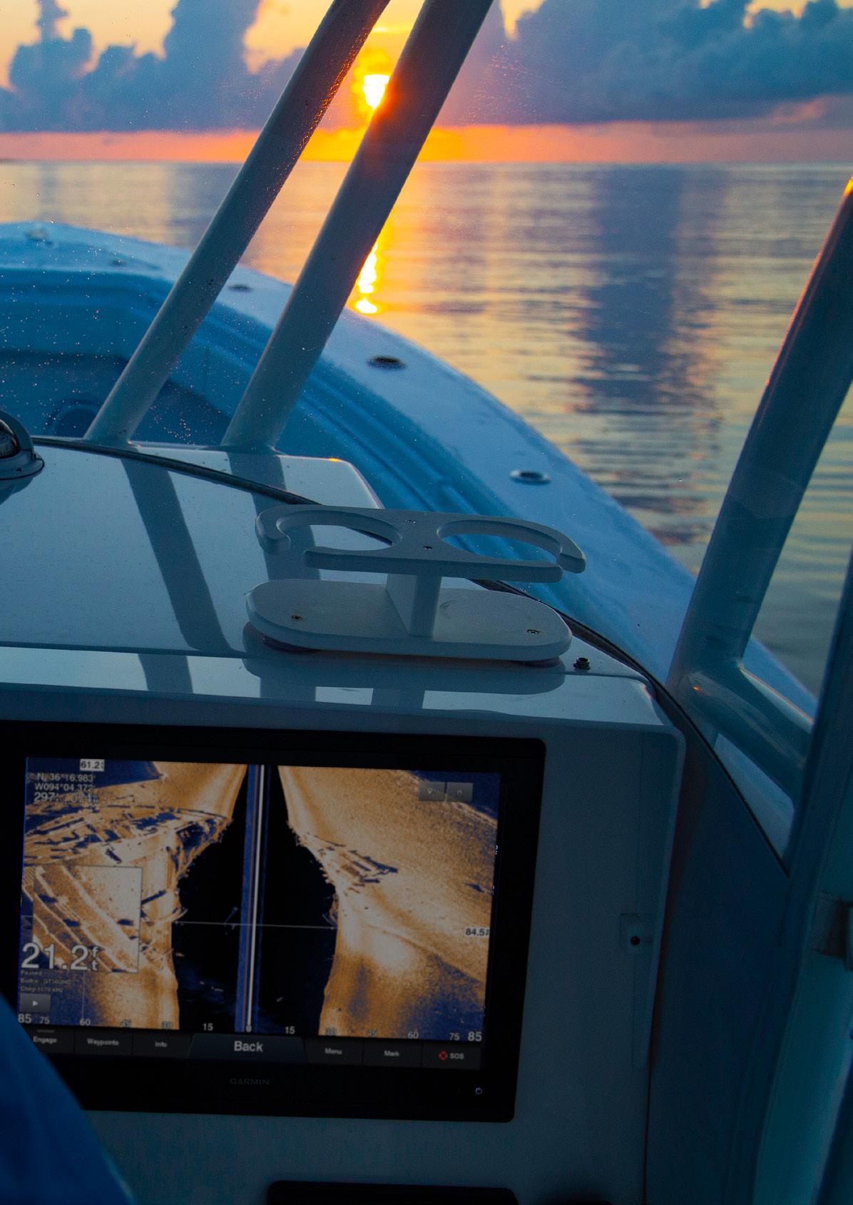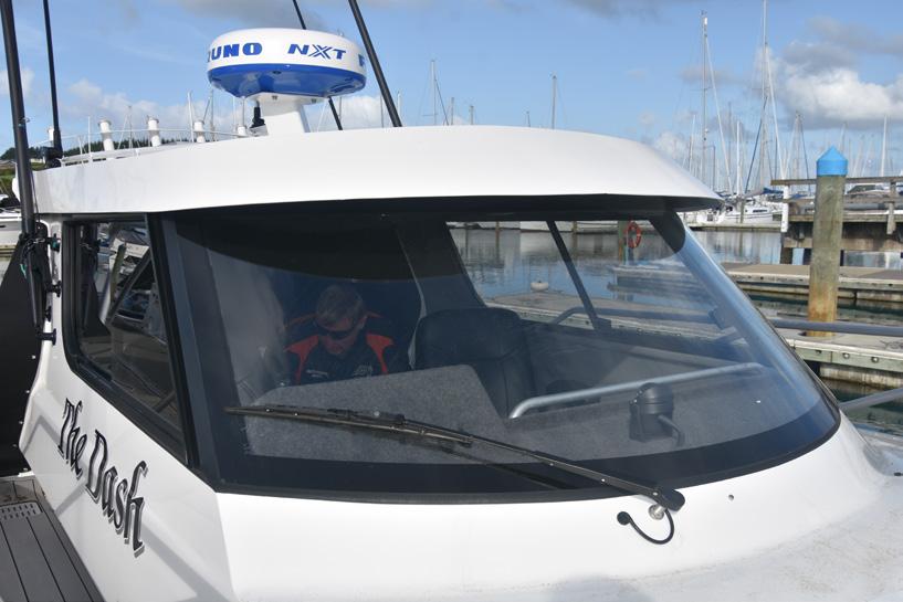covers that hide away the clutter, plus rod racks, DC electric reel sockets, a knee operated hand wash and rod /gaff holders. The Dash was also fitted with an optional pot hauler, which clips in place, so can be removed and left at home if you don’t need it on your next trip. These side decks can also be fitted with dive bottle storage that can carry as much as 6 bottles.