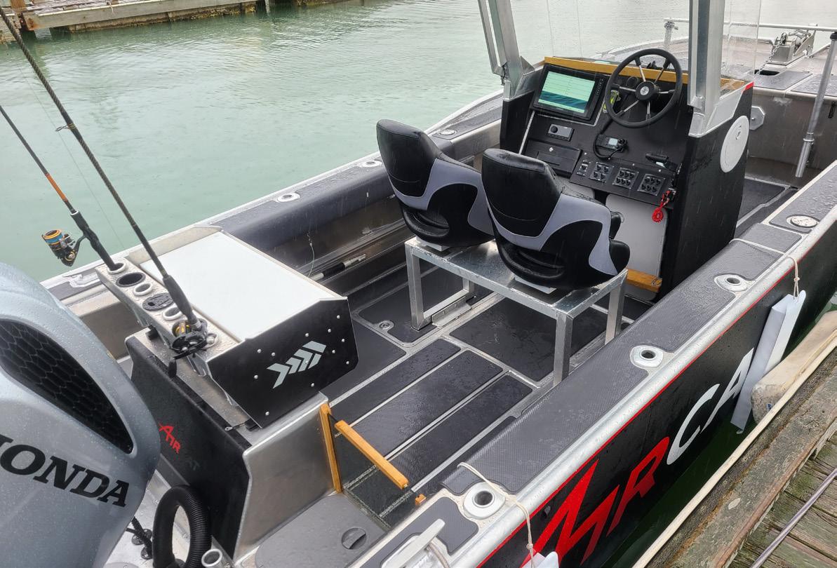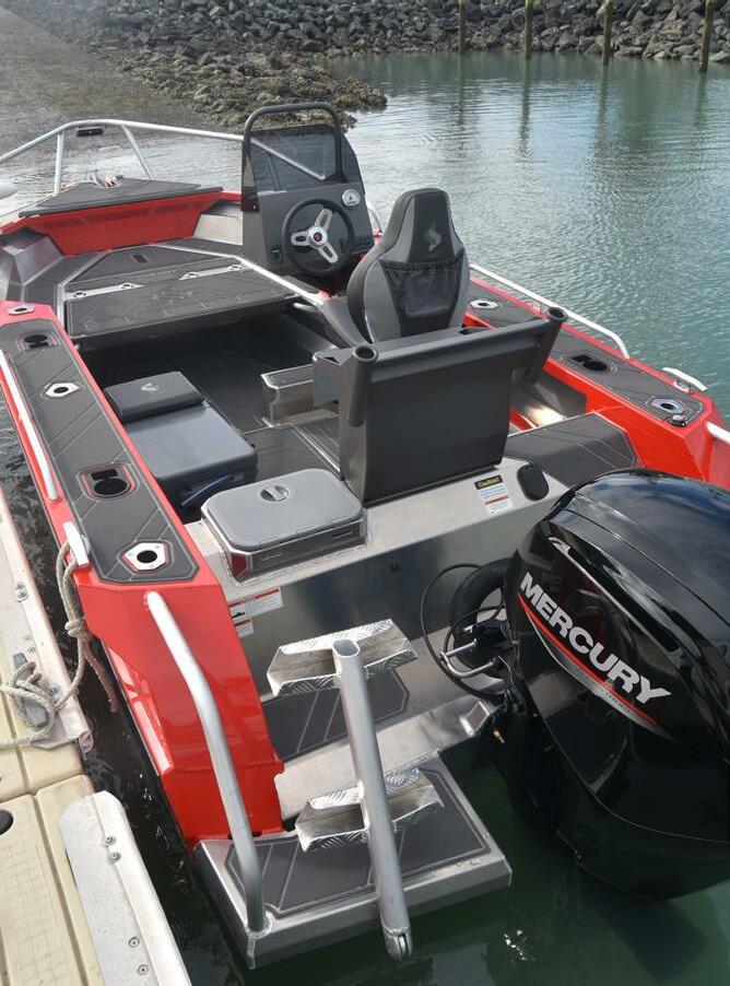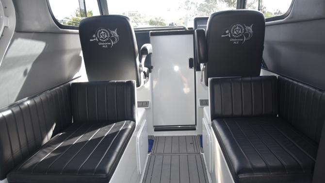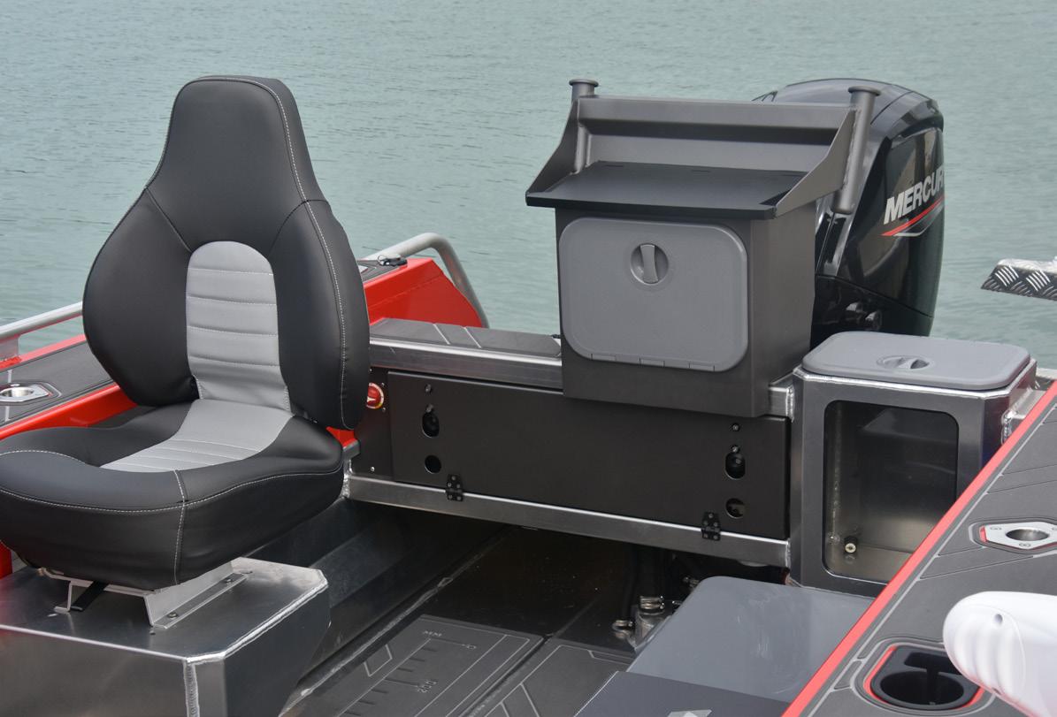Under the U-Dec covered cockpit sole is an extra-large kill tank with a lift-out bin ahead of the engine. A smaller secondary hatch means you don’t have to open the entire floor panel to drop your fish in. While White Pointer refer to it as the Terakihi door for us Aucklanders it’s a snapper door!