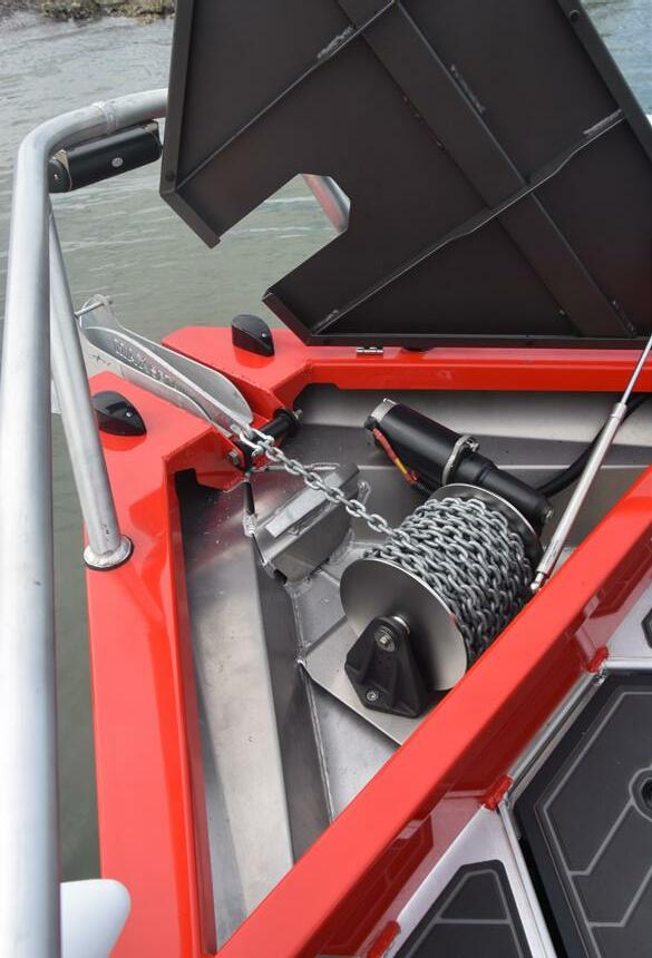 top sunpad. There are rod holders provided in the high bow rails, with popular options including a MinnKota 87 Riptide Terrova trolling motor and a Stressfree NG Maxi drum winch.