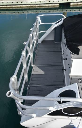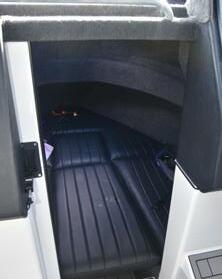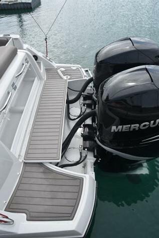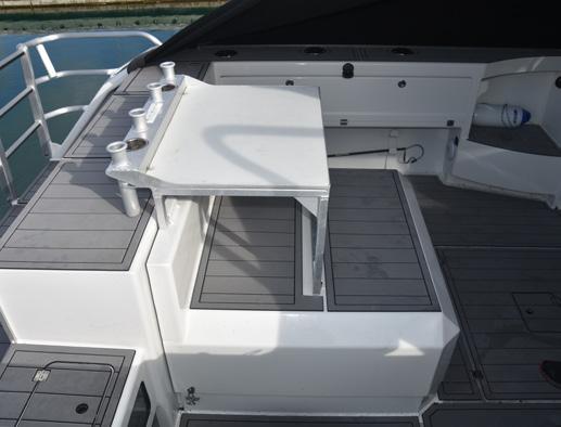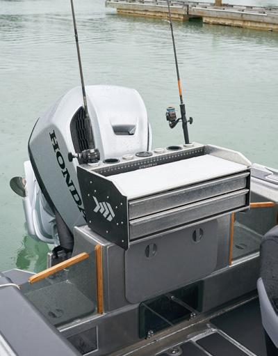 for a flat boarding platform. Access from the cockpit to the boarding platform is from the starboard-side walk-through with a live bait tank combination and the port-side aft transom has a concealed sink, fresh water hot and cold facility. White Pointer has customised this to suit the customers requirements.