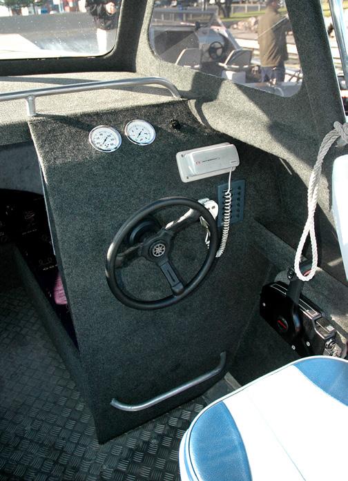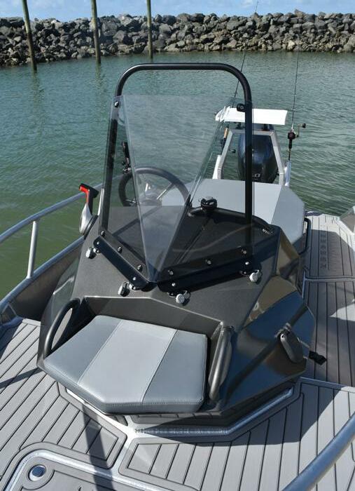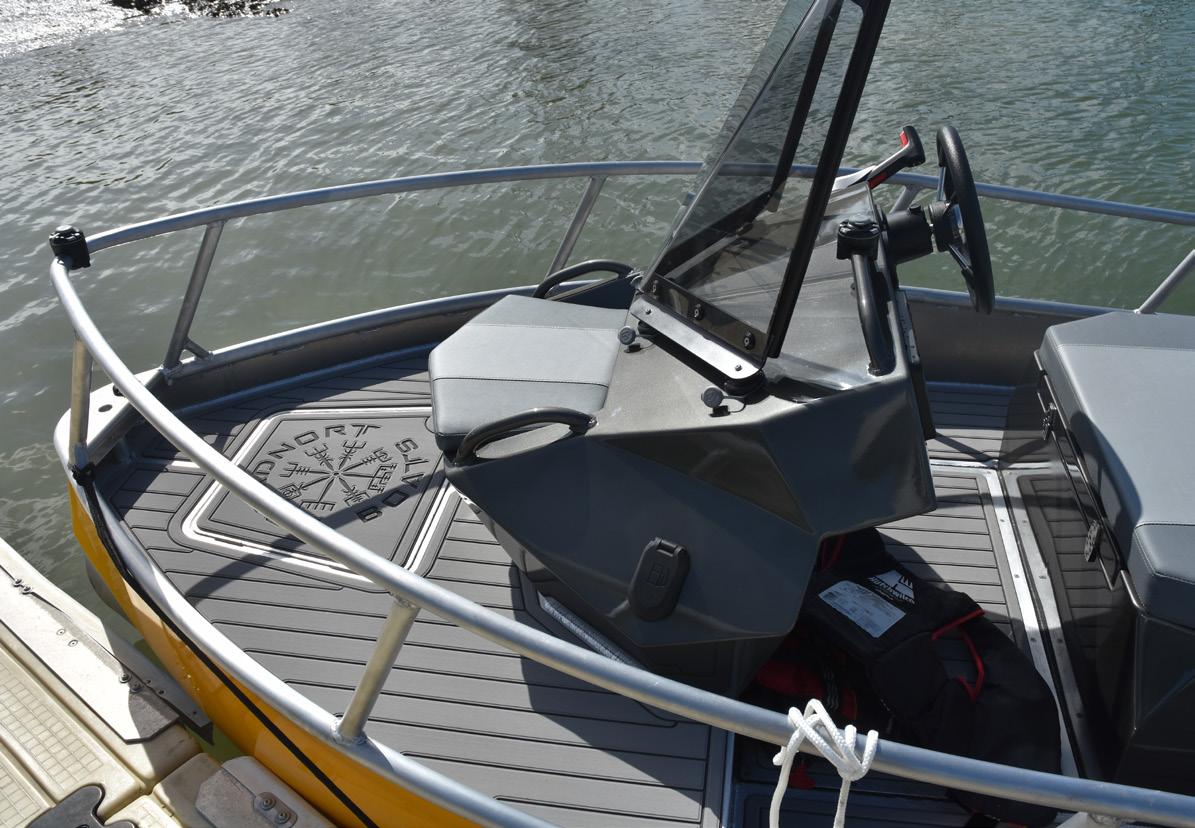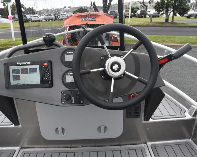 of the helm station layout and seating arrangement. A wide, but exactly the right length, centrally positioned seat, with tons of storage below, is positioned perfectly behind the steering console which comes equipped with a more than adequate, slightly curved, and easily removable windscreen. All necessary instrumentation is provided and installed in a sensible, intuitive fashion in the centre console. The wheel and throttle control are comfortably and aesthetically fitted, making this vessel easy to drive in any conditions.