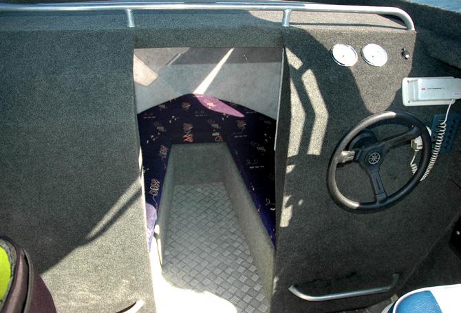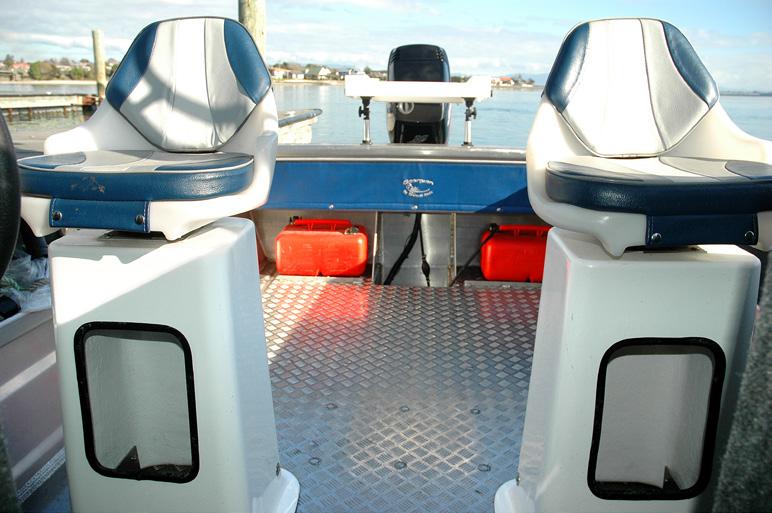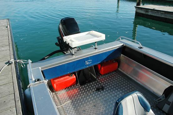 Despite its size, this craft is filled with useful and innovative features, many of which I’ve not seen on other small boats. For example, the usual retrieve/secure welded eye on the bow is replaced with a watertight hole through the hull. Unconventional, but practical for easily hooking on in order to winch the boat onto its trailer. The removable bow roller, housed in the self-draining anchor locker is a very clever idea. I liked this along with the fact that the anchor locker can also be used for a ‘quick to get to’ fish storage chest. In addition, the huge storage capability under the helm seat provides more than ample room for a big chilly bin while still
