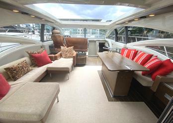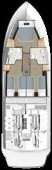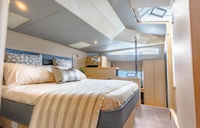 A retractable roof slides away to open up the saloon with natural light and extra ventilation. Down below there is a spacious owner’s stateroom, which occupies nearly half of the lower deck, but also in a usefully proportioned twin-berth guest suite on the port side with a bright and big VIP suite in the bow.