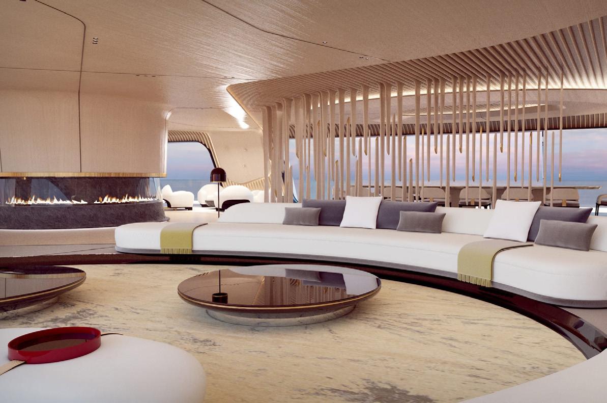 opted for a hybrid Azipod CRP (contrarotating) propulsion system from ABB. Innovation and cutting-edge technology is evident throughout the design. The hull has been conceived with multiple horizontal windows, utilising an advanced glass technology that consists of a series of dots, allowing the view from within to be completely transparent, while from the exterior, the windows appear the same colour as the hull, disguising their appearance. Glass features further in the impressive black superstructure made up of flat glass panels.