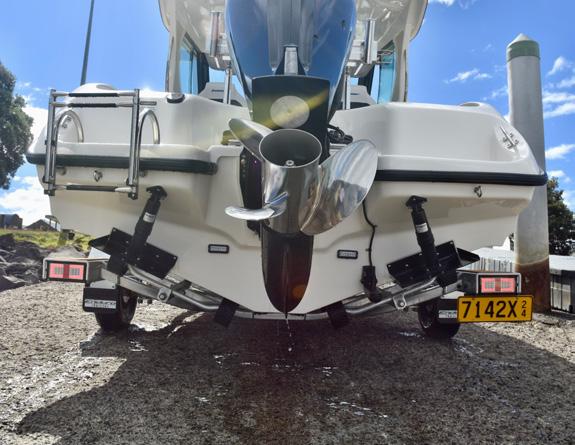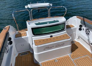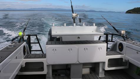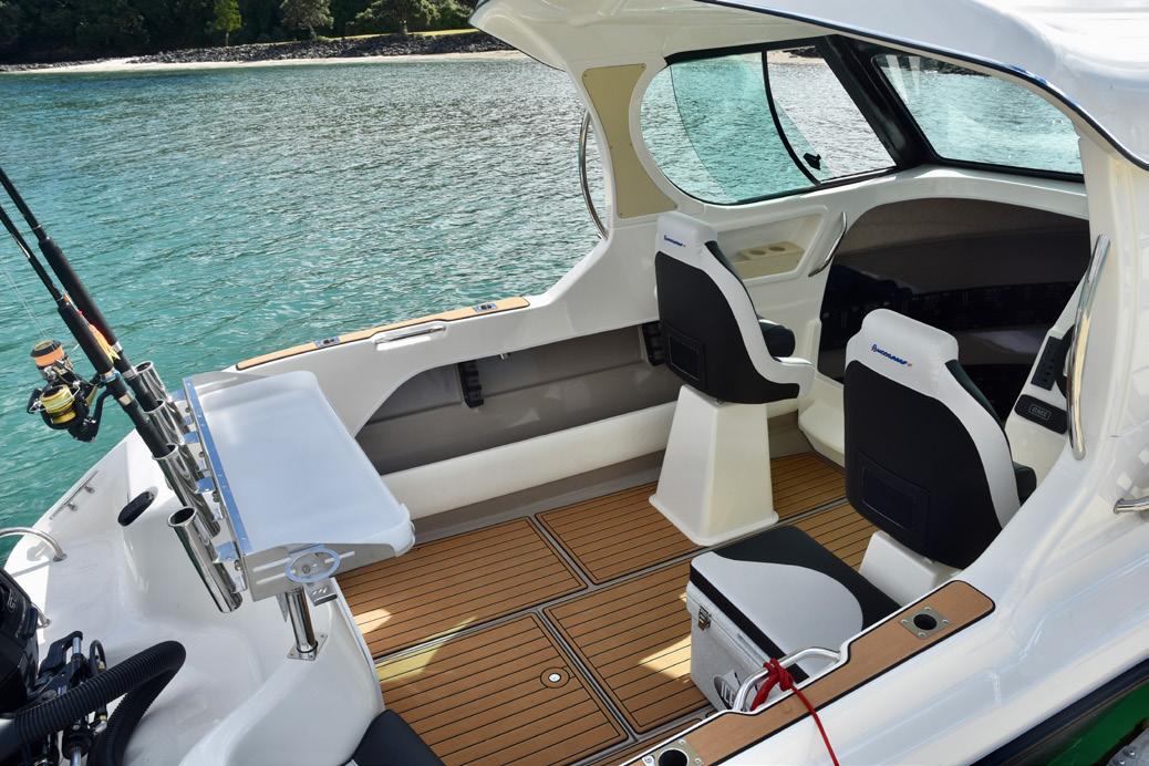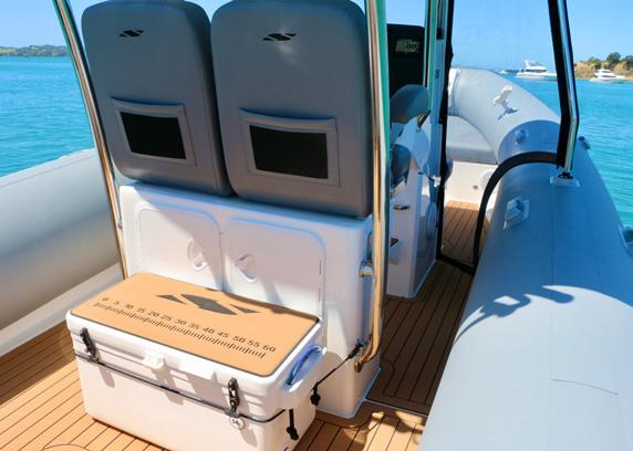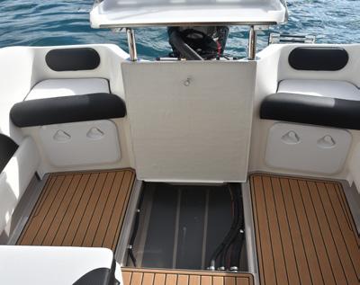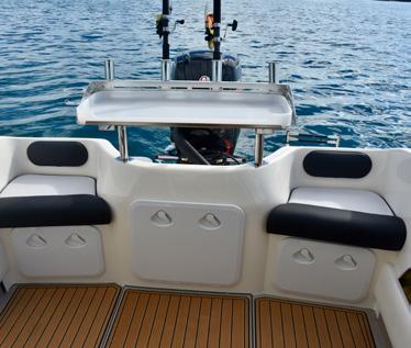 CLEVER: By which I mean, ingenious or slick. Examples? The swim platform for starters. A glance at the image says it all. Slanting the platform away from the outboard allows for a much larger and unobtrusive platform, without compromising the design and performance of the boat. The retractable boarding ladder, while not innovative, is slick. Then there is the ‘chilli bin’, cleverly thought out and incorporated in a very logical position under the double person helm station seat. The list goes on, but so must I.
