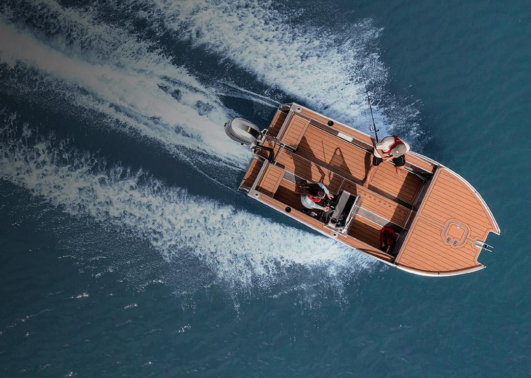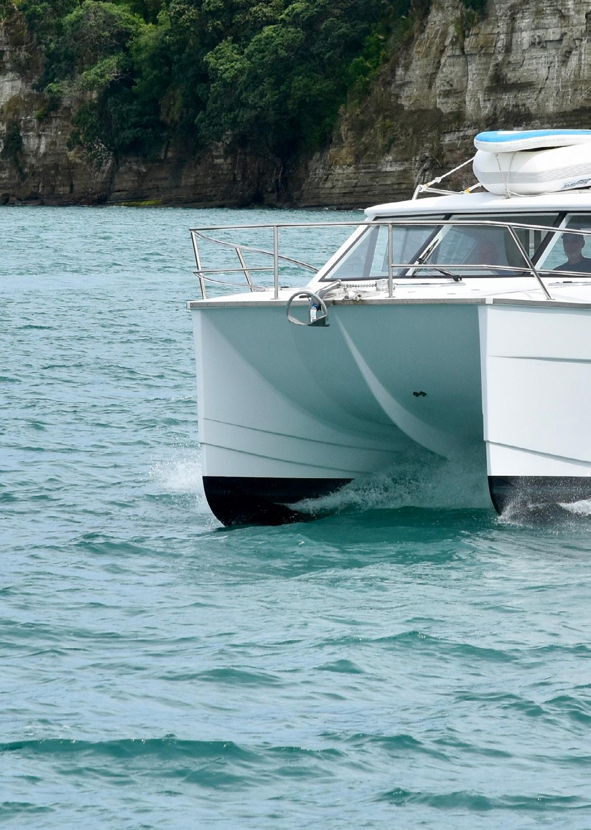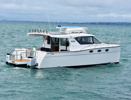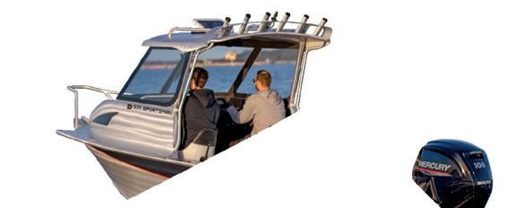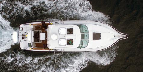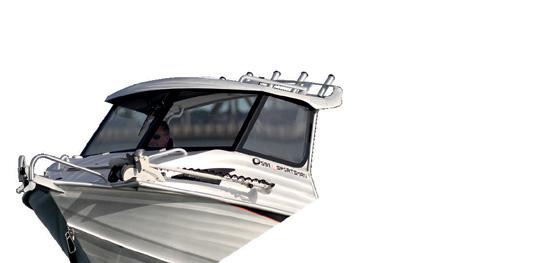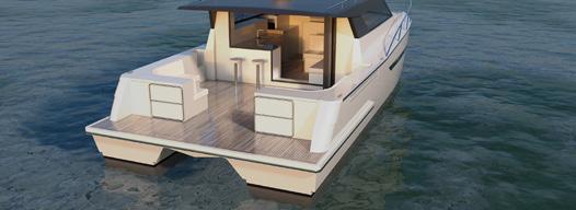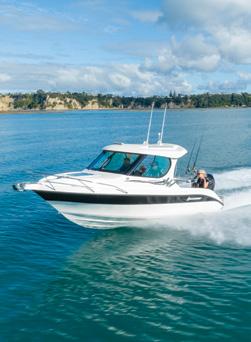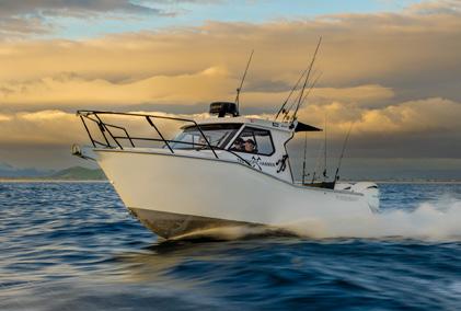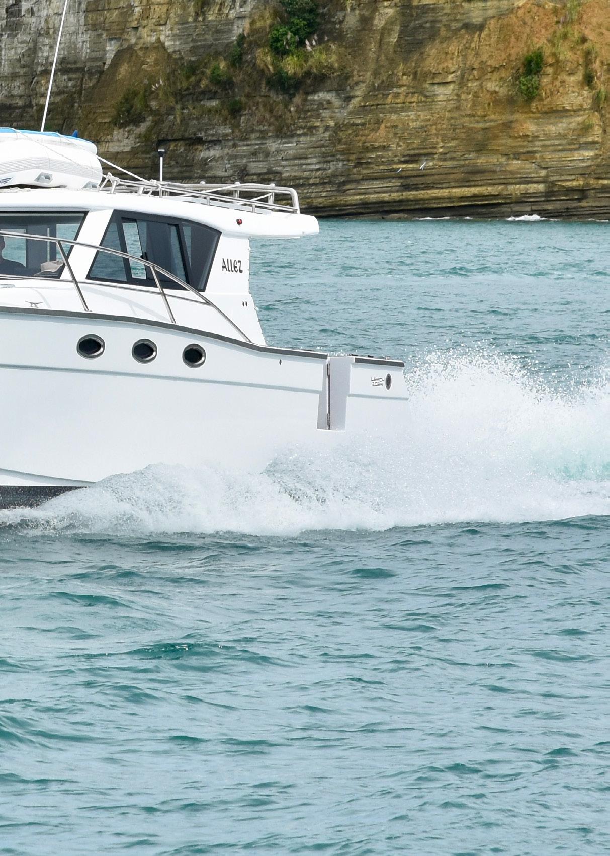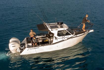 12.4kWh battery pack, which produces maximum drive torque of 3500nm and enables the Overlander to travel at 9km/ hr on land. With a hardtop and a spacious open plan layout, the Overlander can be spec’d for game fishing, diving, or escaping to your favourite bay. The Overlander comes with an impressive range of standard features and can be optioned up with enclosed head (toilet), fridge/freezer, galley and full length V-berth.