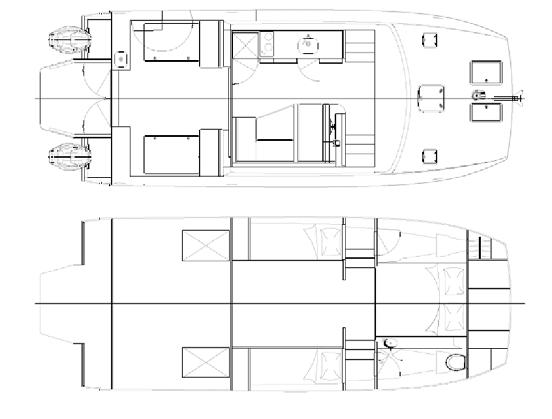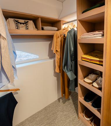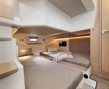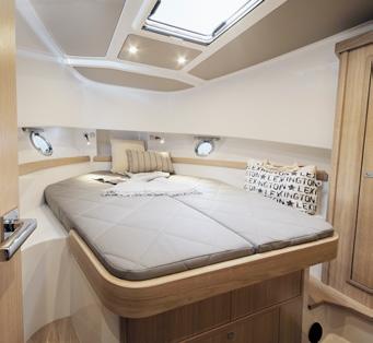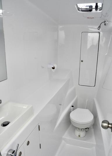 The 36 has lockers in the bow, behind and under the aft deck seating and various options for storage in the engine room. Cabin stowage encompasses hanging space, lockers, shelving, and large wells for stashing items under the berths. The helm position features a very large chart locker in addition to drawers under the seat. No space goes unused.