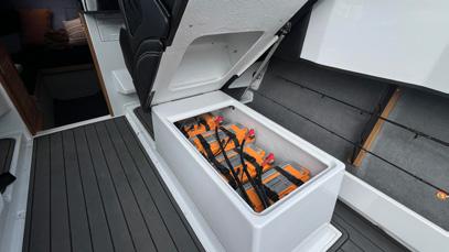 Innovative: Simply meaning a new idea, device or method definitely applies to the onboard fire suppression system. Simple in design, but effective and easy to use. The one place where a fire is most likely to break out is where all the electrics and batteries are housed, i.e. in the helm station console. And while there is an easily accessible hatch, often the last thing you want to do in the case of a fire is give it more oxygen by way of opening the large hatch. Solution, a small opening with a rubber valve in the side of the helm station. If a fire breaks out, simply grab the readily accessible fire extinguisher, poke the nozzle through the rubber valve and operate the extinguisher as normal. The contents of the extinguisher flood the space and job done.
