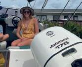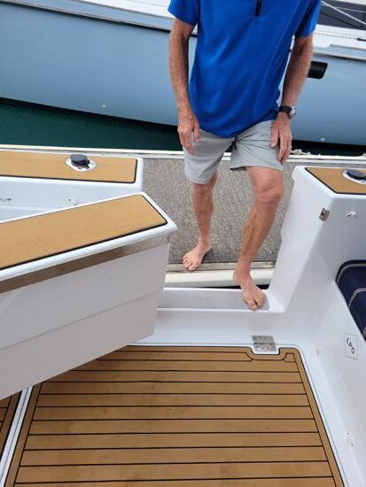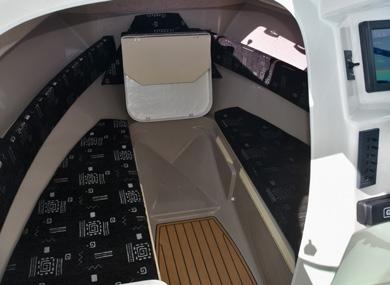 Huge extra storage behind the helm console forward hatch cover with provision for a porta-potty. Removable comfortable sun deck cushions up forward. Twin swim platforms with boarding ladder to port of Mercury 115 Hp Pro X5 Outboard.