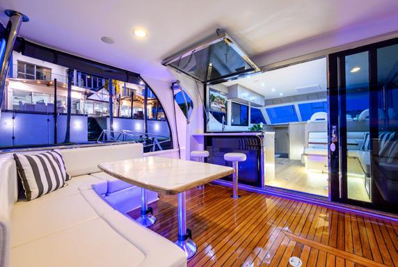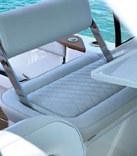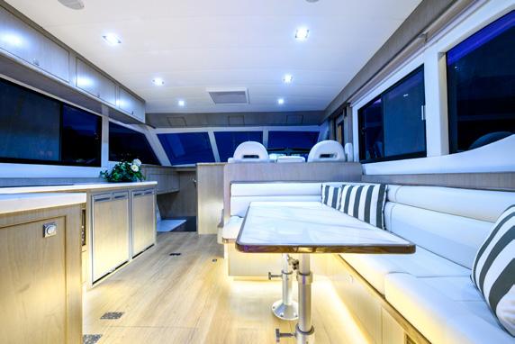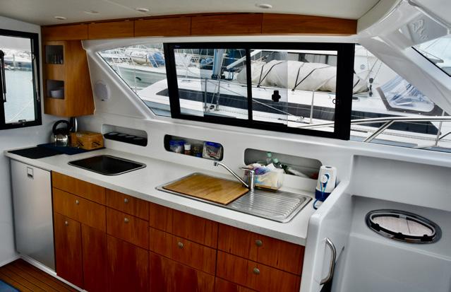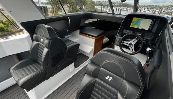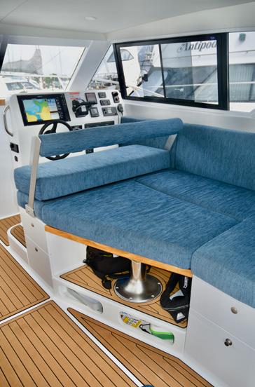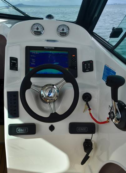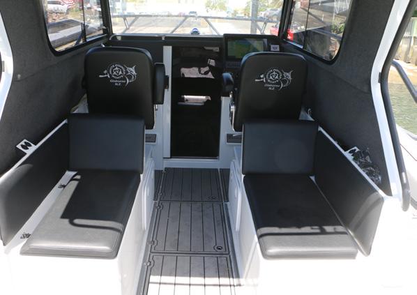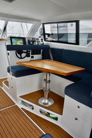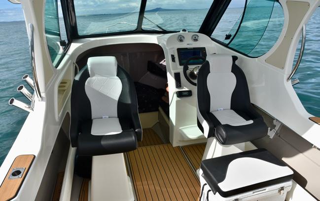 COMFORTABLE: Absolutely! Whether sitting at anchor, or banging through waves, this craft is comfortable. As mentioned earlier, on the day of the test we had to find our own waves, either by creating them ourselves with several tight, consecutive turns or by utilising the wake of a few large craft leaving or entering the Gulf Harbour marina entrance. Firstly, sitting at anchor. I’ve mentioned the ample seating throughout this craft. I didn’t mention how comfortable all the well cushioned seats are. Suffice it to say, they are very comfortable.