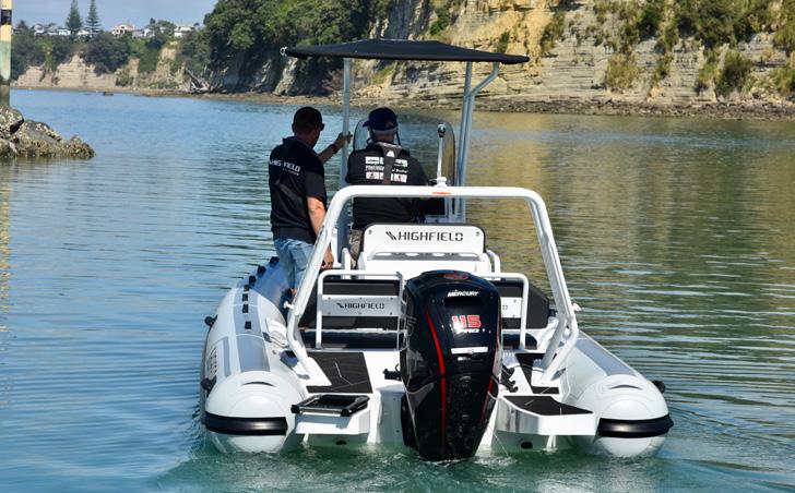 I met Jonathan Tuboeuf, the director of Highfield operations in New Zealand, at the Gulf Harbour boat ramp on a gorgeous Auckland summer day. Sunny, clear blue skies and hardly a breath of wind. Fortunate and unfortunate, as a bit of a rough sea really tells you how good a performer any given craft is out on the water. And, as this vessel is touted as a family boat, the ability